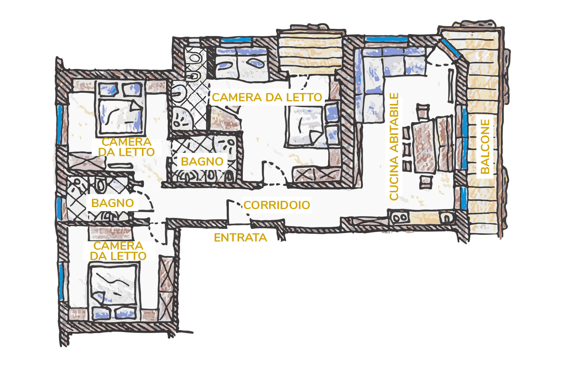 - 2 bagni con servizi igienici, lavandino, doccia, bidet, asciugacapelli e finestra